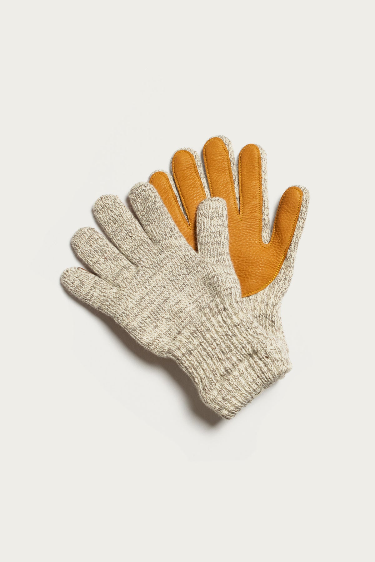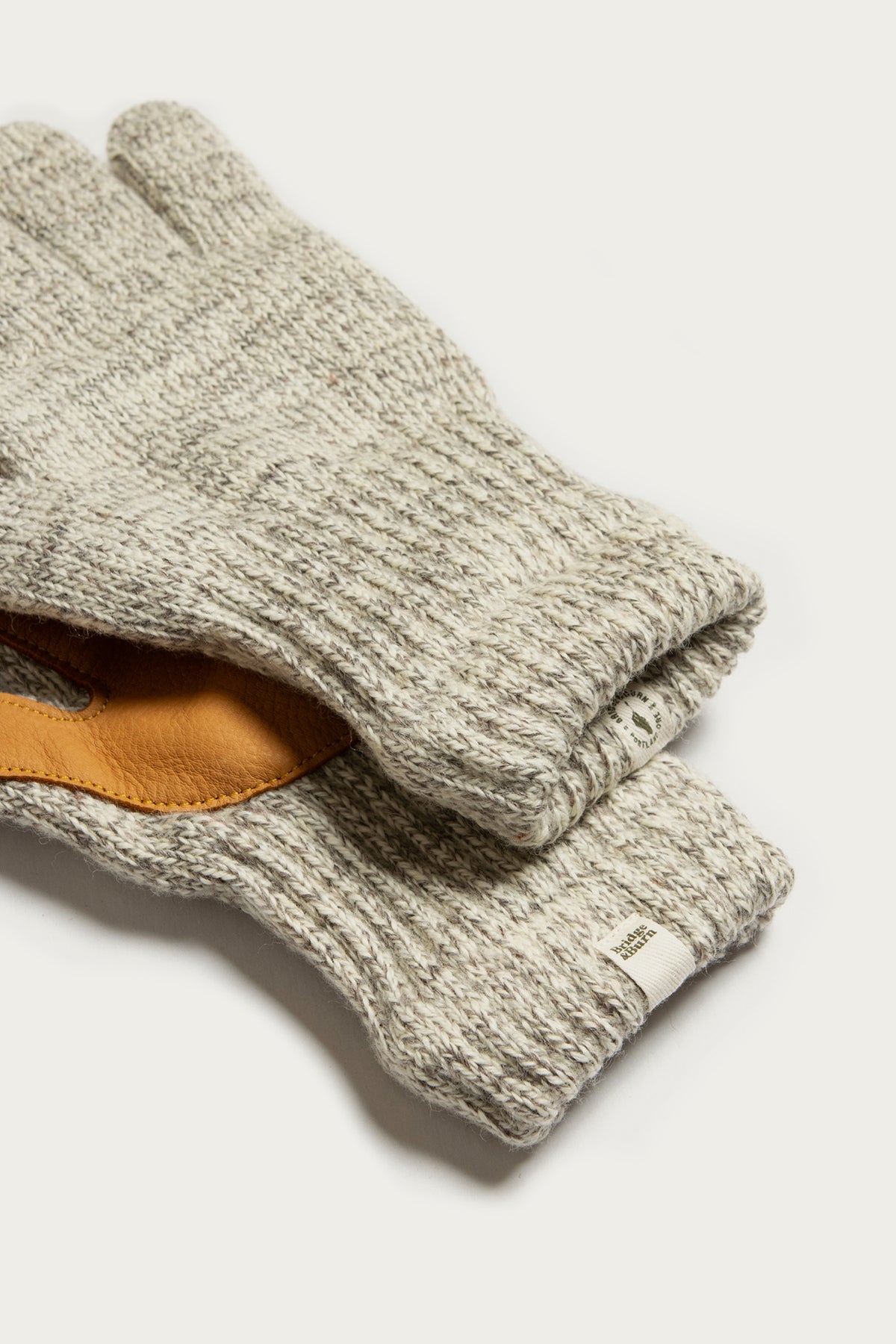 Bridge & Burn’s Ragg Wool Lined Glove in Oatmeal shown flat on a white background—one glove features a tan leather palm, while the other is fully knitted with no leather.