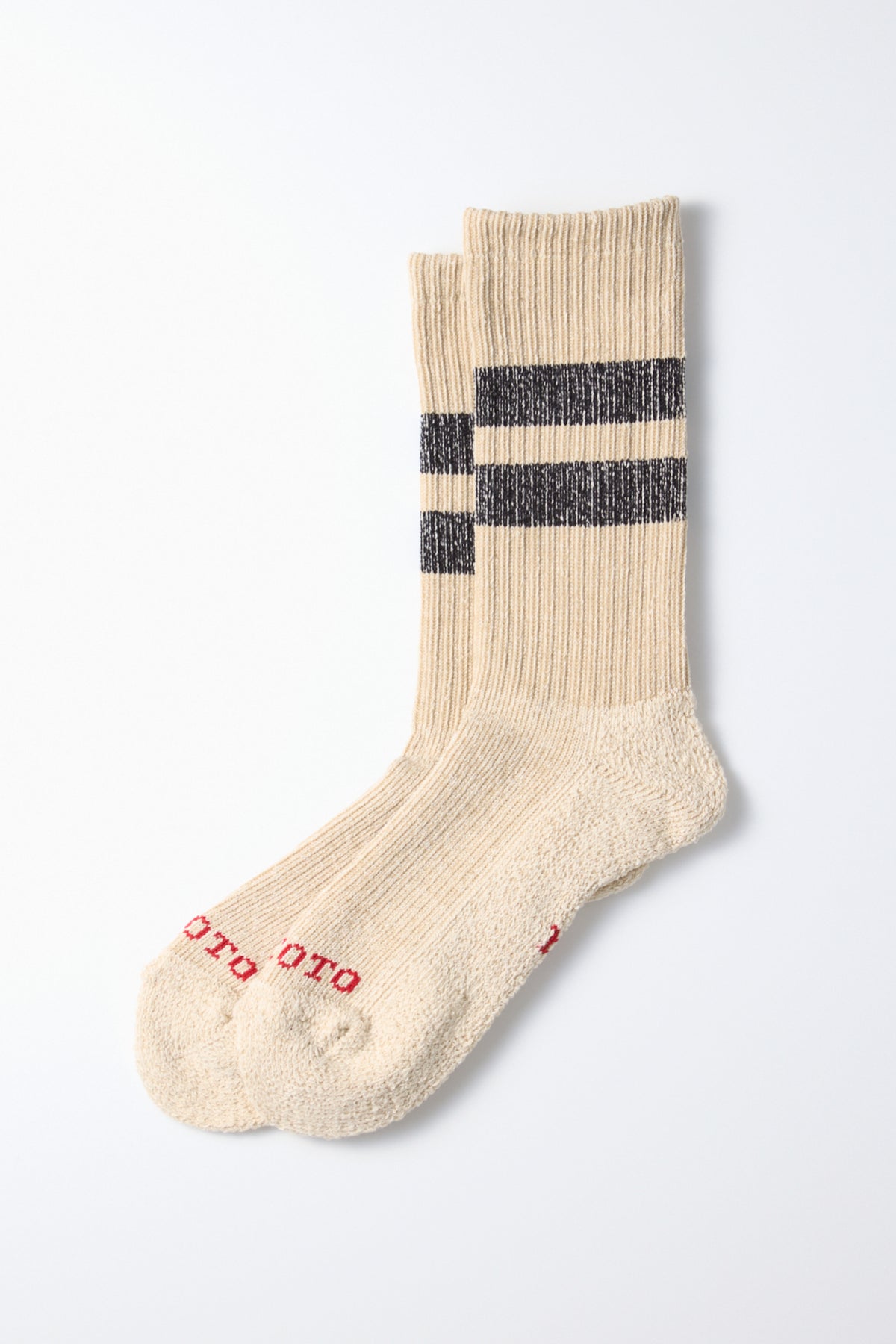 RoToTo Pile Stripe Marl Socks in Beige Black: a pair of ribbed organic cotton socks with two dark stripes near the top and red toe text, laid flat on a white background. Comfortable everyday socks made in Japan by RoToTo.