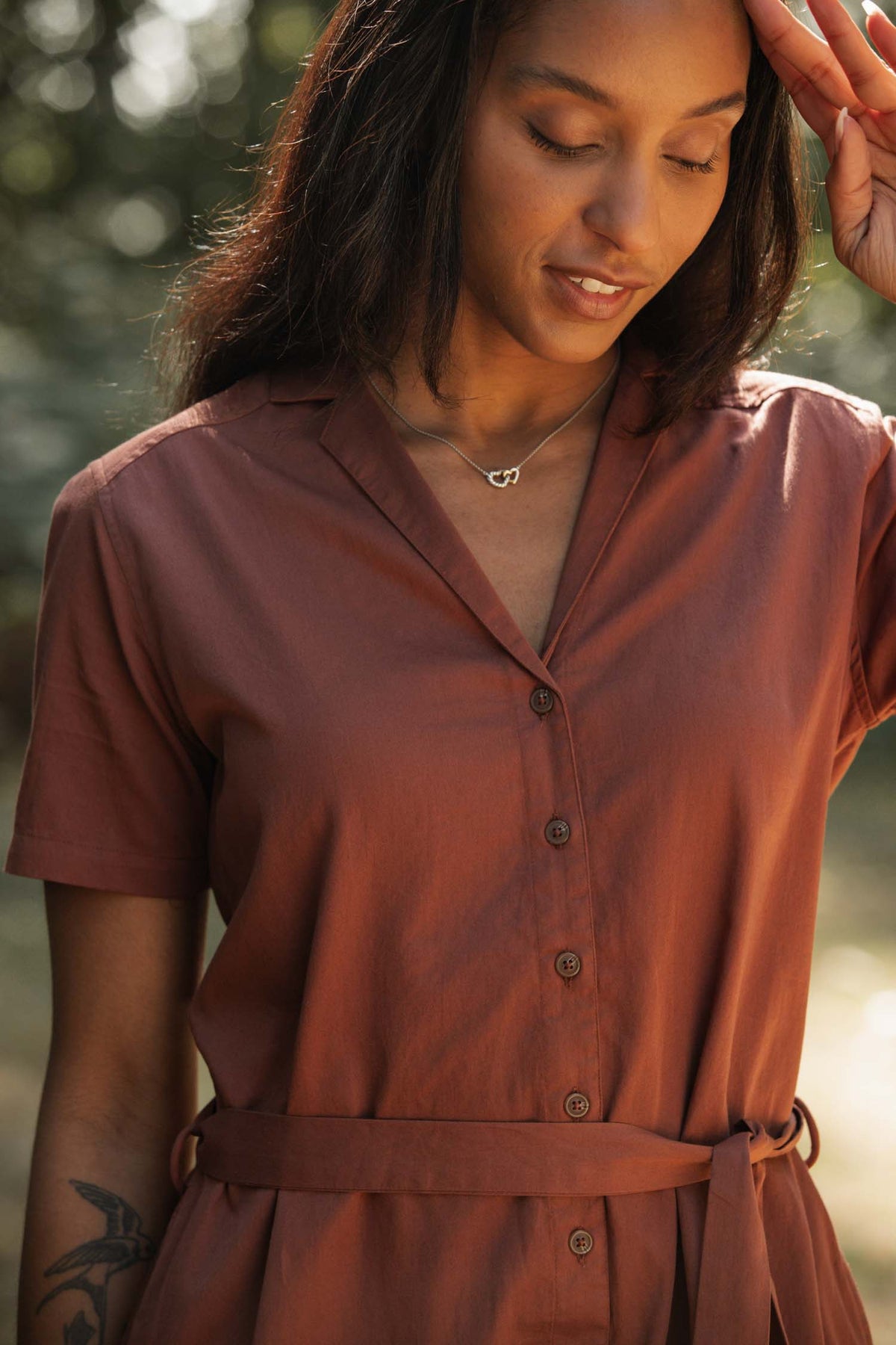 The Sofia is a self-belted button front dress with short sleeves that hits at or just above the knee. It features on seam pockets, gathering at back yoke, and a flat collar. Crafted from breathable organic cotton, this shirt drapes nicely and will keep you comfortable all day long. It's lightweight and wrinkle-resistant, perfect for tossing in your bag for weekend getaways or an evening out.